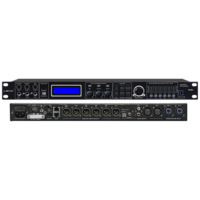 4路可选音频信号输入,2路模拟,一组光纤,一组同轴,每路模拟音频信号输入灵敏度均可选,提供3组5个话筒输入,标准的3.1或5.1声道输出